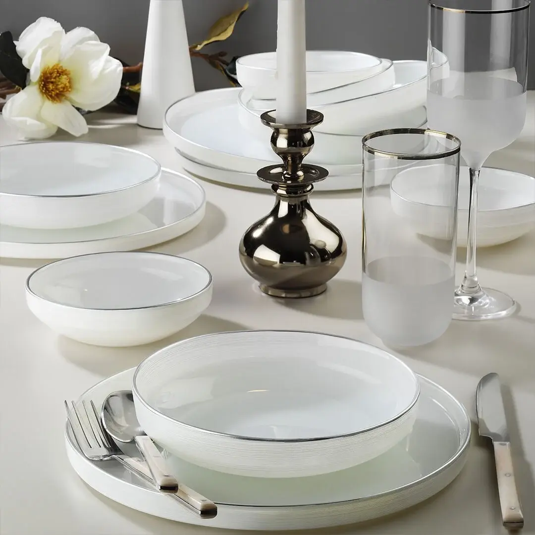 Fecra Circle Beyaz Gümüş Fileli 18 Parça Yemek Takımı ile sofralarınıza zariflik ve lüks bir dokunuş katın!