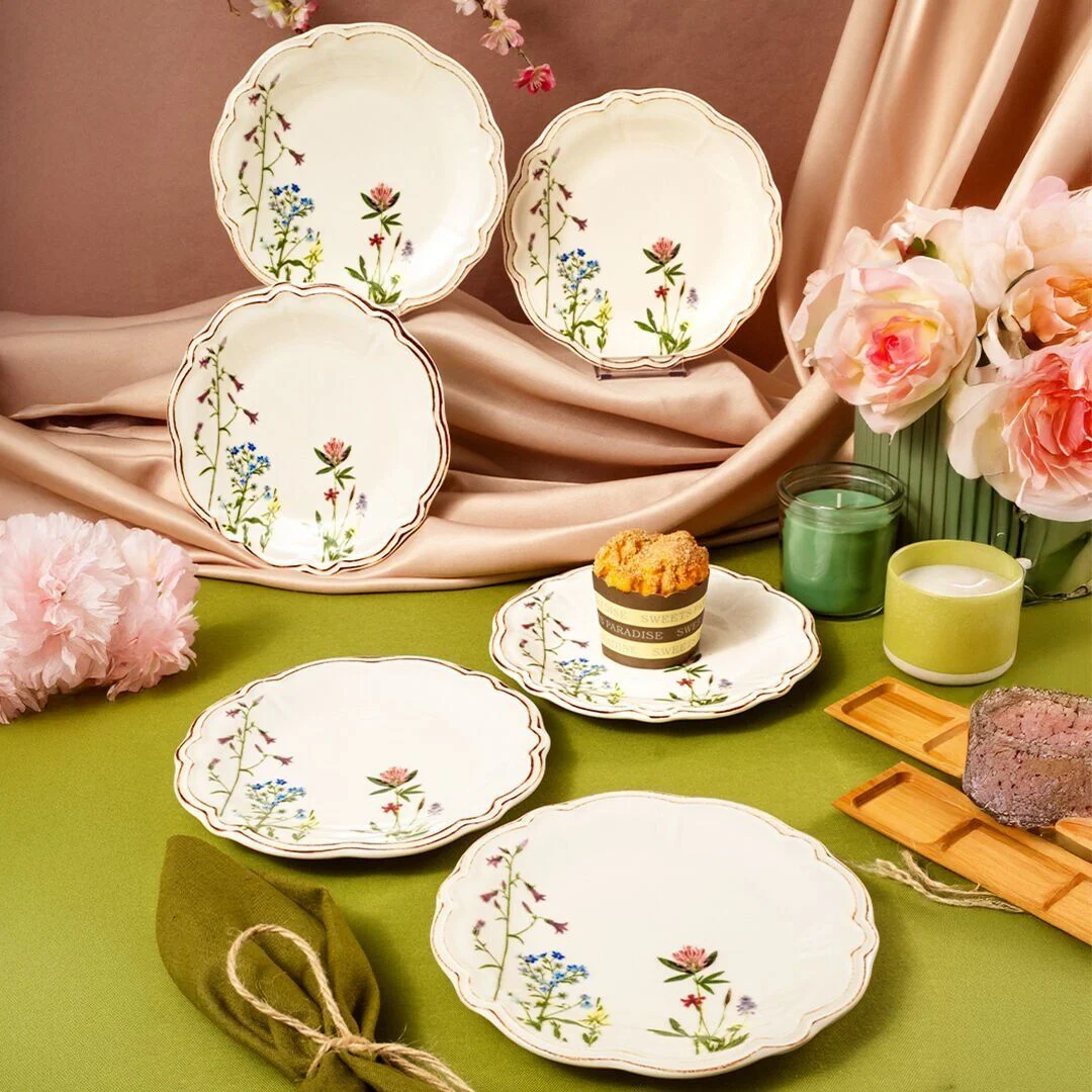 Fecra Doğa serisi, adını ve ruhunu doğadan alıyor. Çiçeklerin zarif dokunuşunu taşıyan bu 6’lı pasta tabağı seti, hem gündelik sofralarda hem özel gün sunumlarında doğallık ve inceliği bir araya getiriyor.