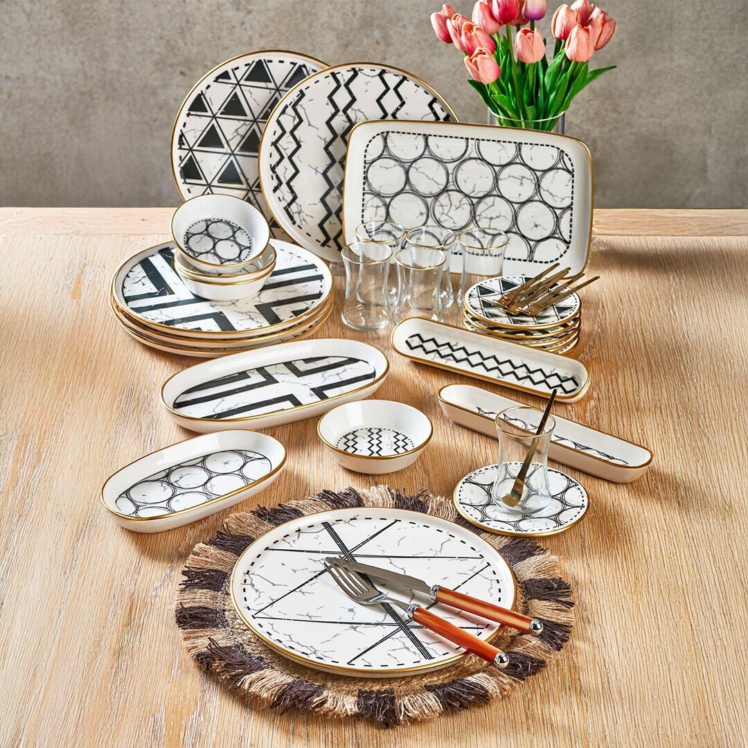 Setin her parçasında kullanılan çizgisel ve dairesel motifler, altın yaldız çerçevelerle tamamlanarak özgün bir sunum deneyimi yaratıyor. Sofralarınıza stil kazandıran bu takım, aynı anda hem dikkat çekici hem de zamansız bir tasarıma sahip.
