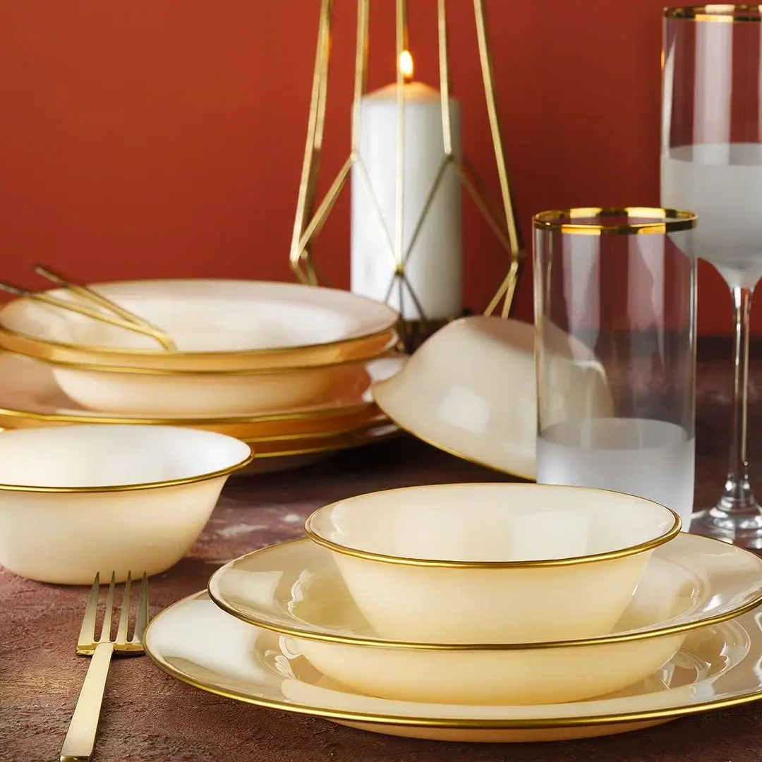 Modern Tasarım: Antrasit Gold rengi ile Somon Krem kombinasyonu, bu yemek takımının ana temasını oluşturur. Her bir parça, ince camın modern zarafetiyle birleşerek sofistike bir görünüm sunar. Üzerindeki altın file desenler, takımı tamamlar ve yemek masalarınıza lüks bir dokunuş katar.
