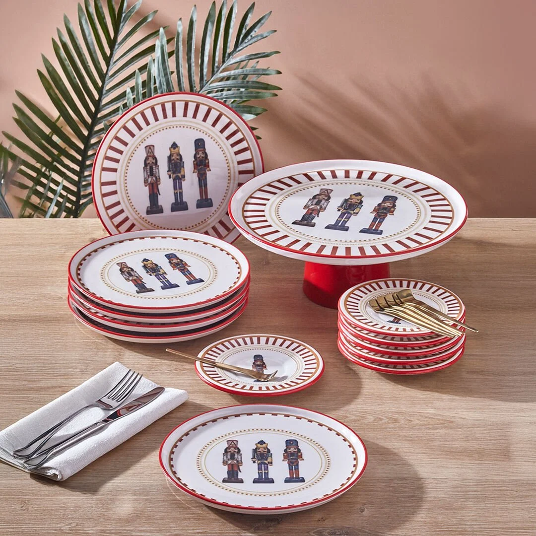 Tabakların ortasında yer alan klasik oyuncak asker figürleri, özenle seçilmiş desen kompozisyonlarıyla birleşerek her sunuma anlatı katan bir tablo etkisi yaratıyor. Bu zarif detaylar, tatlı saatlerini ve çay ikramlarını sadece bir sunum değil, bir atmosfer deneyimine dönüştürüyor.