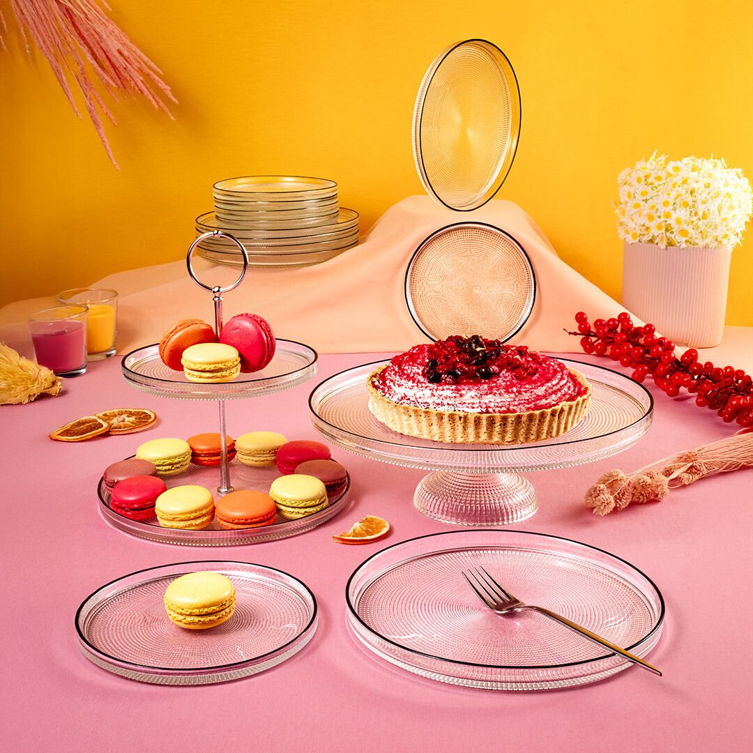 6 kişilik kullanım için hazırlanan bu set, misafirlerinize modern ve uyumlu bir sunum sağlar. 16 cm ve 21 cm olmak üzere 2 farklı ebatta toplam 12 adet cam pasta tabağı içerir.;