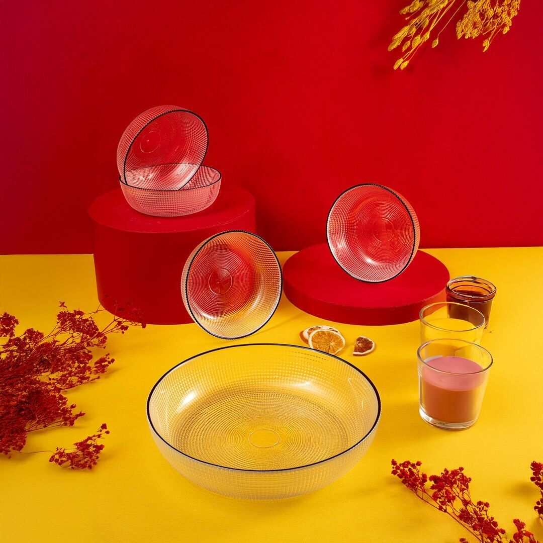 Sette yer alan 1 büyük kase (24 cm) ve 4 küçük kase (14 cm), çerez, popcorn, meyve ya da farklı atıştırmalıklar için idealdir. Hem tekli kullanım hem takım olarak uyum içinde sergilenebilir.