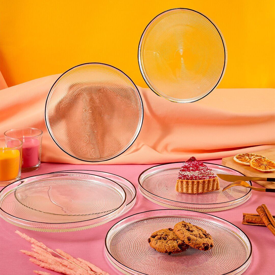 21 cm çapındaki 6 adet servis tabağı, pasta, tatlı, kurabiye ya da atıştırmalık sunumlarınızda işlevselliği ve estetiği bir arada sunar. Geniş yapısı sayesinde konforlu bir sunum alanı sağlar, masanızda simetrik ve şık bir düzen oluşturur.