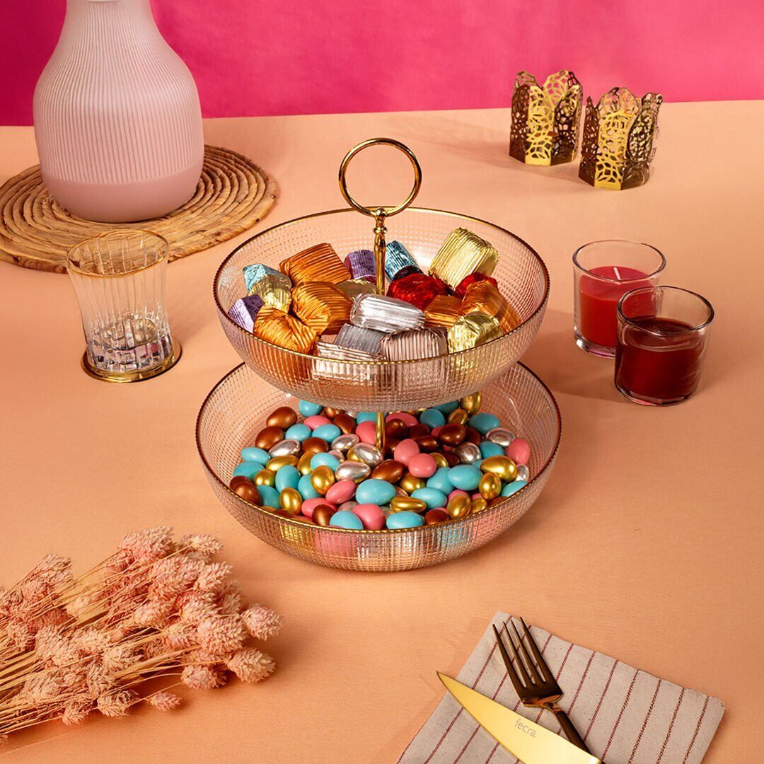 Bayram şekeri, draje ya da çikolata sunumları için iki katlı tasarımıyla hem yerden kazandırır hem göz doldurur.