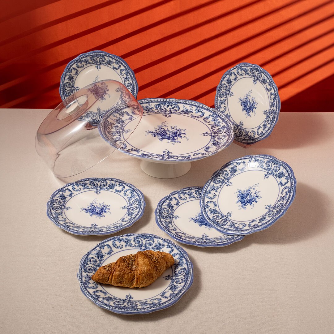 Fecra Majestic Blue 8 Parça Sunum Seti, klasik mavi tonlarının asaletiyle sofralarda zarafetin doruk noktasını sunar. Desenleri, 18. yüzyıl Avrupa porselen sanatından ilham alırken, modern hatlarla yeniden şekillendirilmiştir.