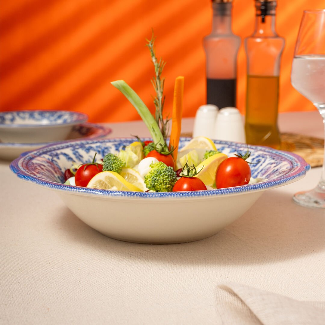 25 cm genişliğiyle hem salata hem de ana yemek sunumlarında kullanılabilir. Geniş formu sayesinde sofrada merkezi bir duruş sergiler; salatalar, meyveler veya soğuk başlangıçlar bu kaseyle adeta bir tabloya dönüşür.
