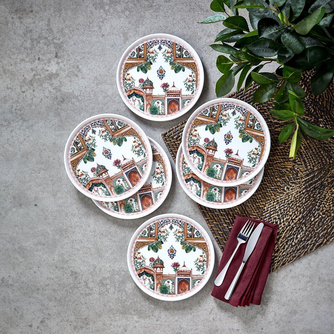 Bu 6’lı set, her biri aynı desenin farklı açılarla yorumlandığı tabaklardan oluşur. Bu da sunumlara dinamizm ve sanatsal bütünlük kazandırır. Özellikle temalı sofralarda koleksiyon havası oluşturmak isteyenler için birebirdir.