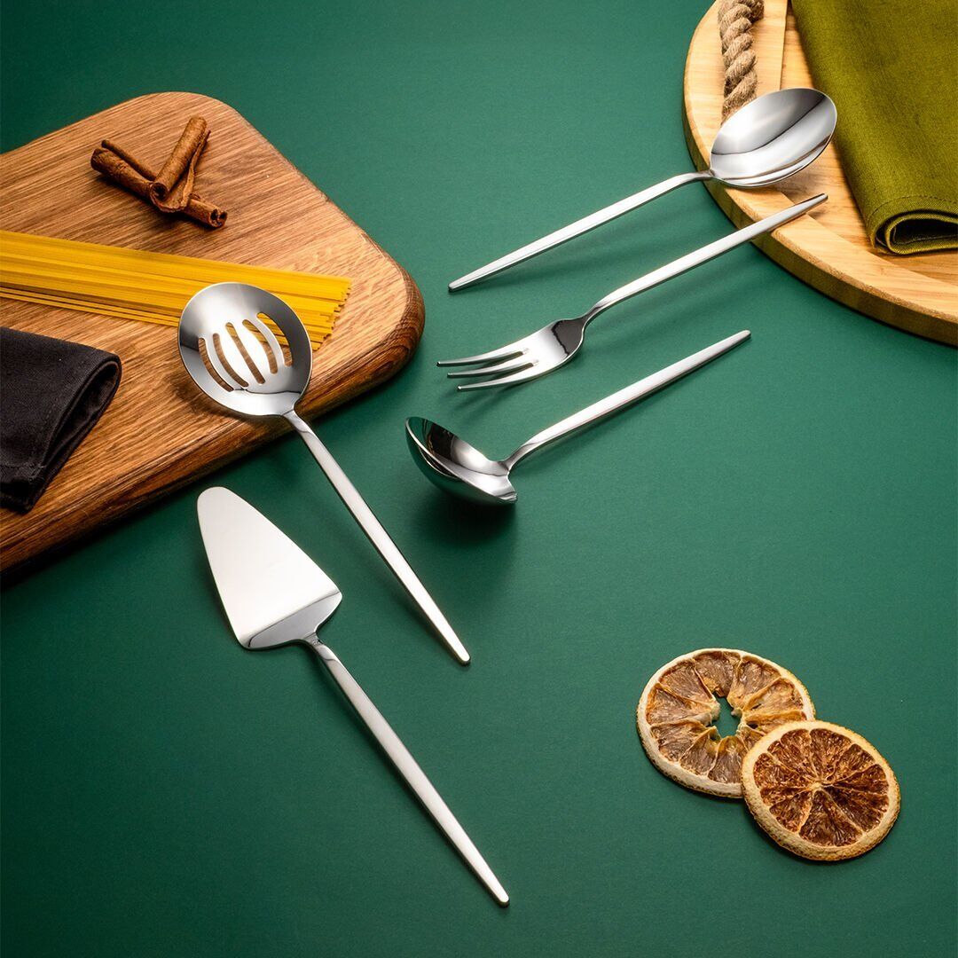 Fecra Pure 5 Parça Servis Seti, sade çizgileri ve modern formuyla sofralarınıza zamansız bir şıklık kazandırır. Parlak yüzeyi, ışığı zarifçe yansıtarak sunumlarınıza sofistike bir dokunuş ekler.