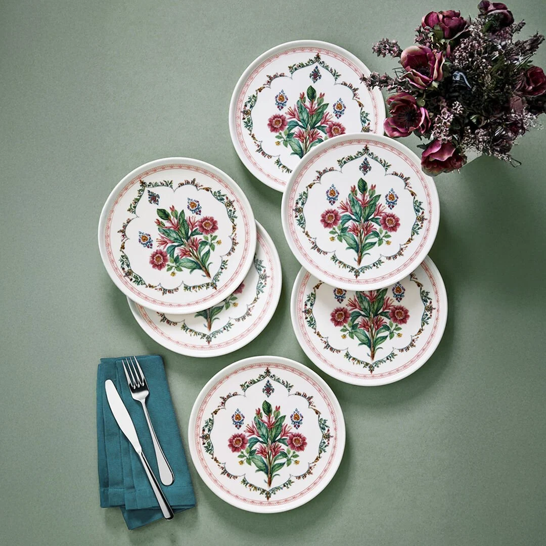 Her biri 6 kişilik sunumlara uygun olarak tasarlanan bu 6 adet pasta tabağı, derin renk doygunluğu ve detaylı desen işçiliğiyle dikkat çekiyor. Üzerinde yer alan floral motifler, geleneksel kültürün zarafetini modern sofralara taşıyor.