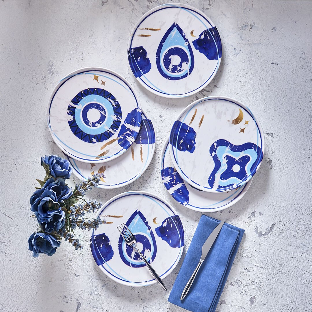 Her biri farklı nazar formuyla hazırlanmış 6'lı tabak seti, misafirlerinize sunum yaparken her tabakta ayrı bir hikâye anlatmanıza olanak tanır.